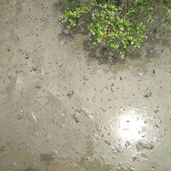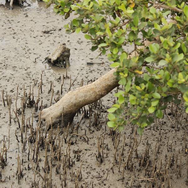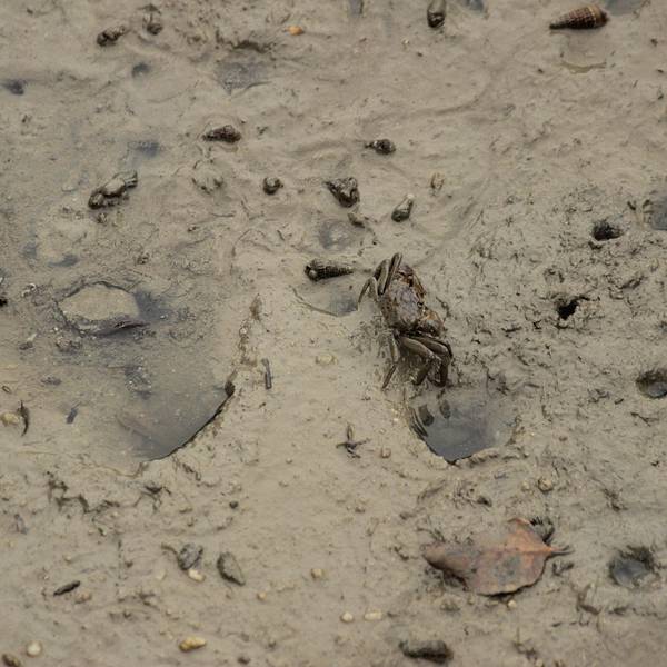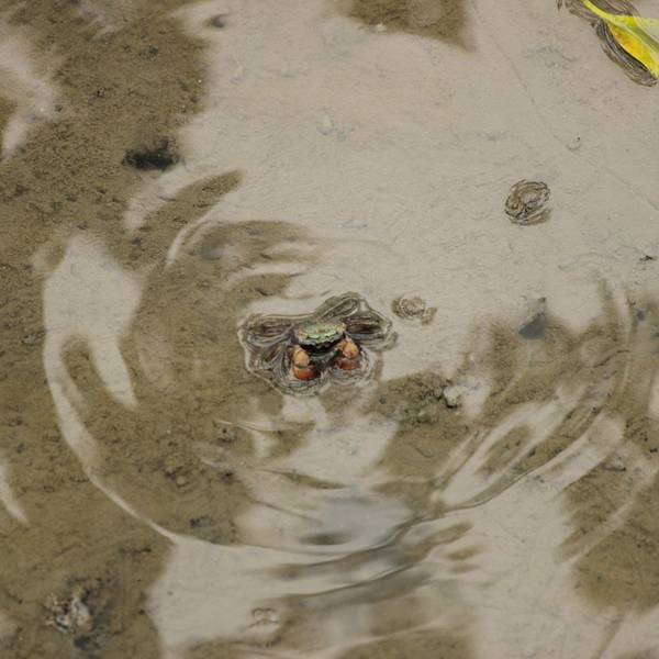 树林下没了海水,一些小雨小蟹在挣扎。