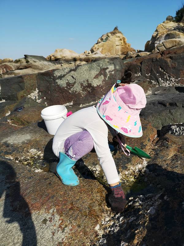 下午三点退潮了,我们还去讨小海了,旅社老板备好了工具,水鞋,手套,小桶铲子,真贴心,带着我们开车到海边,去挖挖贝壳,看看地笼里的海获,孩子开心坏了。