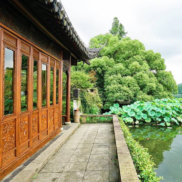 郭庄位于西湖风景名胜区西岸的杨公堤,紧邻曲院风荷,是一座小巧的江南园林。它建于1907年,因有汾阳郭家曾在此居住而得名。这里虽然规模比较小,但假山、水池、亭廊样样俱全,巧借西湖之景,是西湖边出色的品茶赏景之处。园内以池塘为中心,入园首先是“静心居”,是主人曾经的起居会客之所。而后可见池塘,引自西湖之水,有曲廊假山环绕池边,还建有“两宜轩”、“赏心悦目”、“景苏阁”等亭阁。秋季时的曲廊摆满菊花,红色黄色的落叶洒满池塘,颇有意境。郭庄与苏堤相望,这里游人不多,在临着西湖的平台上小坐,或是品茶聊天,看看远处的群山和雷峰塔,很是享受。每到夏季,这里还能欣赏湖边盛开的荷花,湖风拂面,很是清凉。