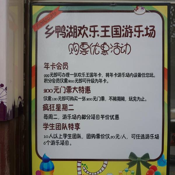 乡鸭湖欢乐王国游乐场来过多次,在宜良县南盘江边乡鸭湖小区里面,算是昆明周边性价比很高设施比较新的一个儿童主题公园。从昆明过来开车全高速,耗时大概50分钟左右。 周边环境: 这里周围吃饭休闲的地方很多,停车方便,玩累了可以就近吃饭或者休闲!对面就是帝豪KTV,楼上是酒店,斜对面是个酒吧,白天可以过去坐着喝喝茶,环境很棒。门口一路上都是吃的,木桶鱼,荣盛园也在对面,附近还有电影院,带孩子过来玩累了可以吃个宜良烤鸭再回昆明,或者直接在附近入住酒店,这个片区是新开发的,道路宽阔,周边有日新达等小型超市,买些生活必需品也很方便。 游乐设施: 毕竟是新建的游乐场,比起老牌游乐场更加高大上,设施比较新,玩起来也很放心。旧旧的始终觉得像九十年代初的公园,不喜欢。 服务: 去过多次比较有发言权,收银员态度很一般,倒是工作人员面对小朋友多,所以比较有亲和力,也认真负责,去游乐设施上都亲自过来确认是否系上安全带。 价格: 游乐场本身价格便宜,而且游乐场现在有活动通票是100元,团体票还更优惠,具体项目的价格详见价目表!个人推荐太空漫步,海盗船,还可以划船,旋转木马很豪华很新,可以拍出偶像剧里的感觉!(^_^)