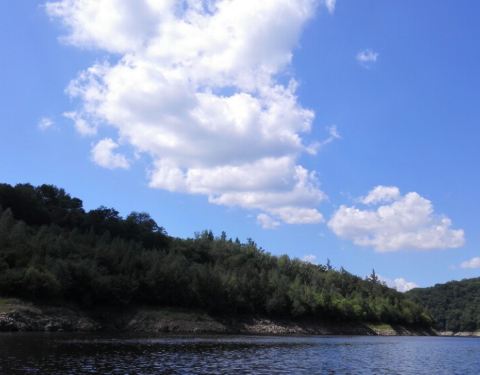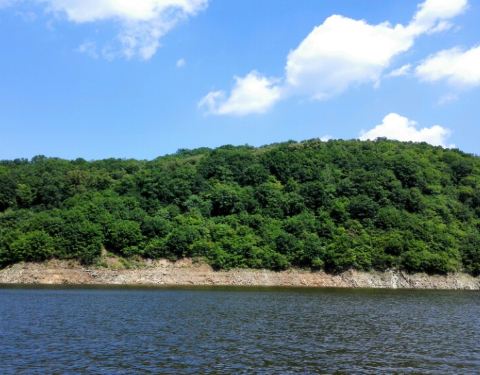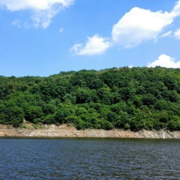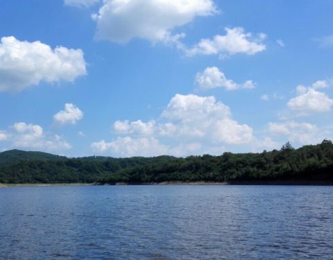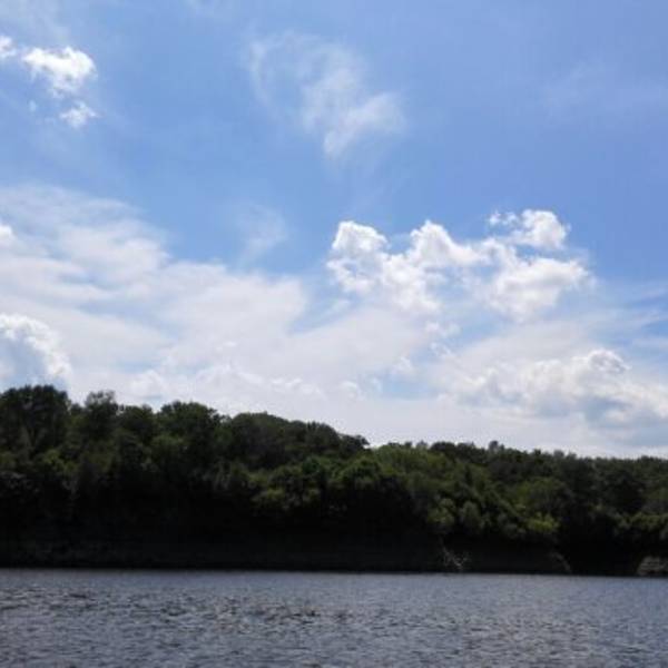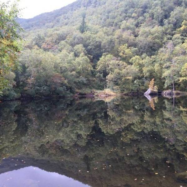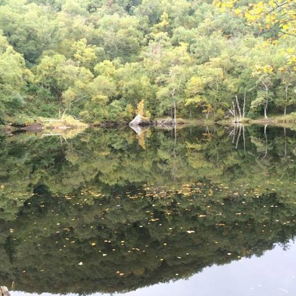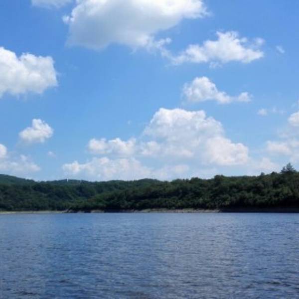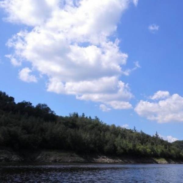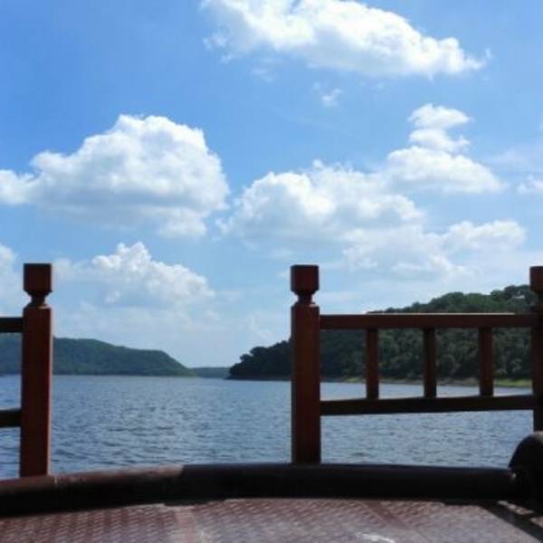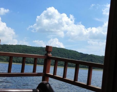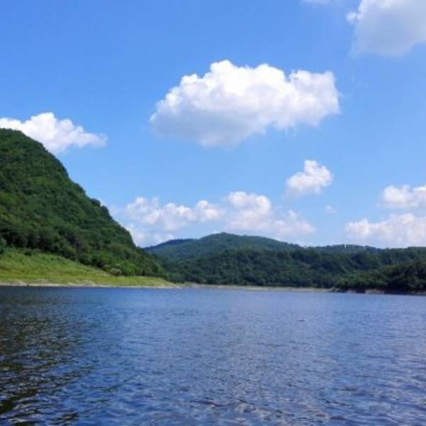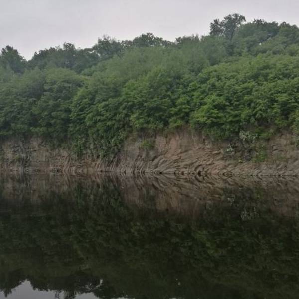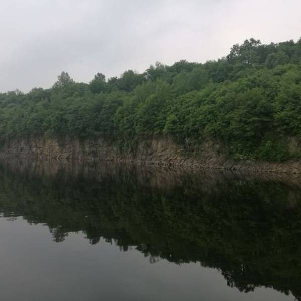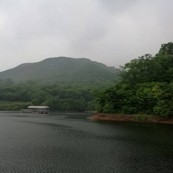 长白山的二道白河镇驱车一小时来到雪山飞湖,这里一个大型的水库,四面环山,崖壁上有年轮的图标。坐船二十分钟才能看到。很美。