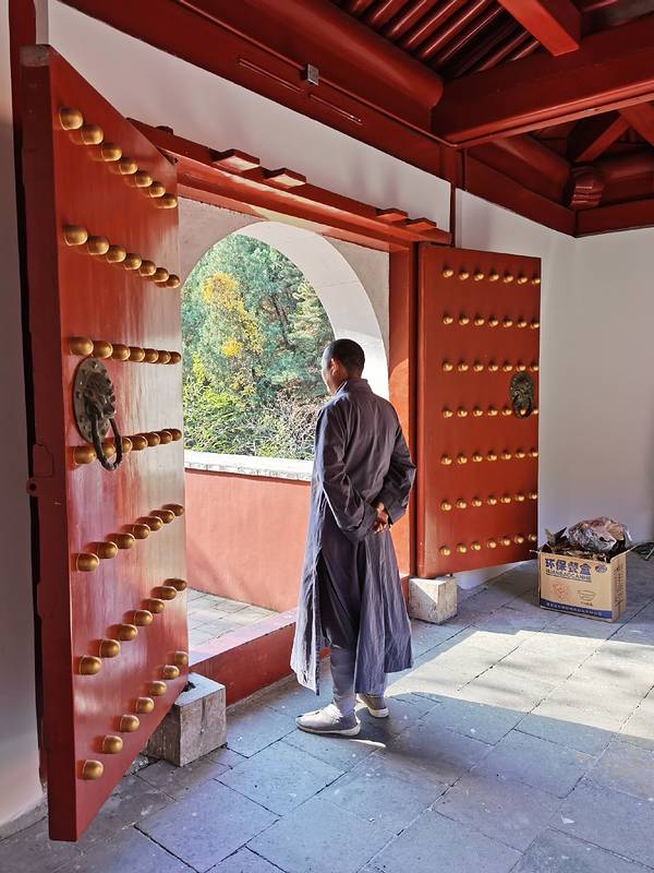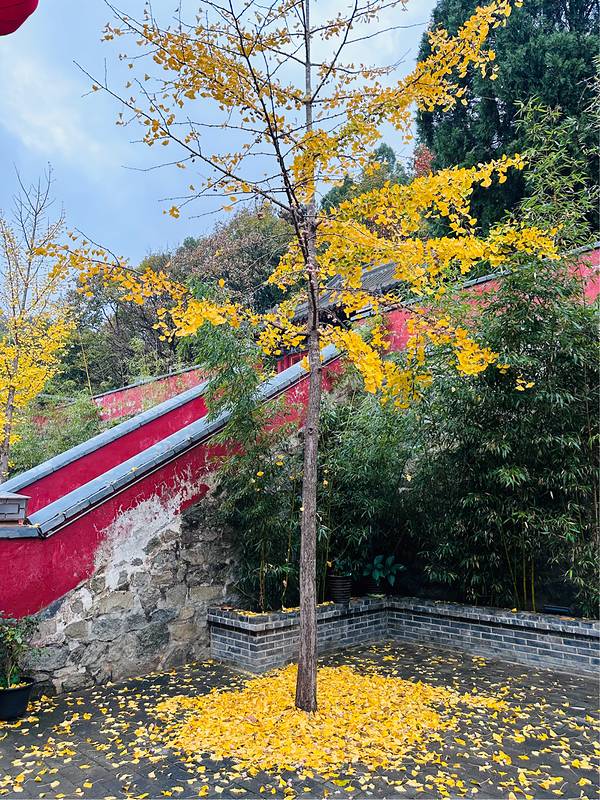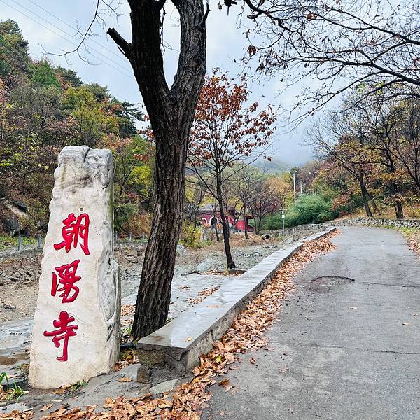 如果你认为这就是终点那就错了,问过寺中的师傅,才知道继续往山林深处步行,还有诸多风景藏在山中。我们一路前行,途径了很多打卡🤳点,能想象到春夏旺季的时候这里会多热闹。步行🚶🚶♀️约2公里,终于到了最终目的地,朝阳寺,两只狗狗🐶在庭院里似乎等待多时,一直在呼唤我们。寺中的银杏叶落了一地,特别出片。寺中的长老看到我们雨天还来拜佛,给了我们一人一个开了光的桔子🍊,非常香甜。