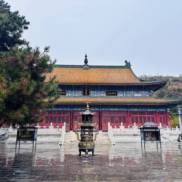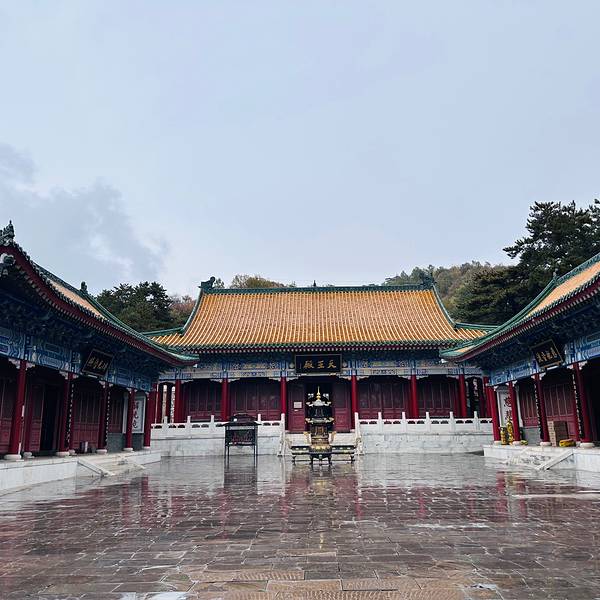 沿着石阶继续往山林深处走,就可以看到朝阳禅寺,穿过寺门就是座落三面的殿,供奉着不同的神仙,再往里走就是大雄宝殿,一颗大松柏🌲遮住些许视角,加上今天游客极少,以及雨水🌧️落在地上呈现的倒影,真的每一处风景都像电影🎞️中的场景。
