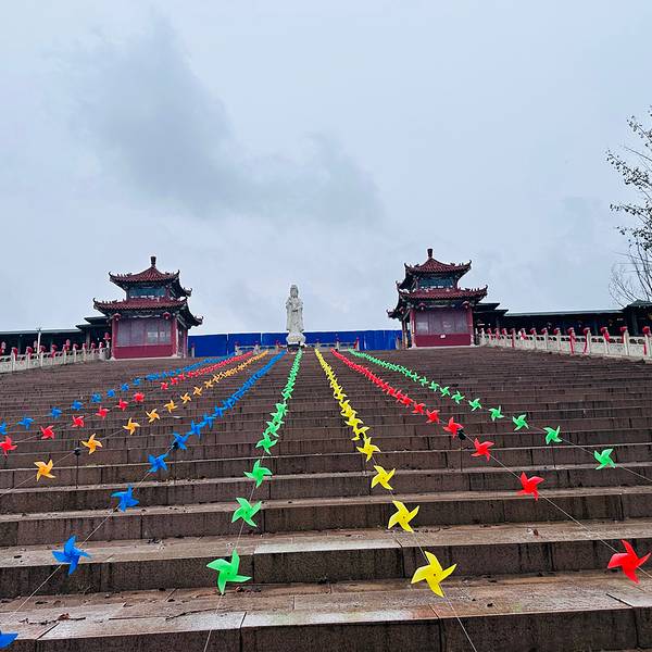 进入大门能看到一排长长的台阶,台阶的尽头就是圣水观音,通往观音的台阶上拉起了好几种颜色的小风车,观音端坐在上方,好似迎接着众多信徒。圣水观音后方就是七星池,只可惜进入秋季🍂池水渐少,露出了池底的泥土,围着七星池有一圈环形的廊桥,沿桥步行一圈也需要耗费不少体力。