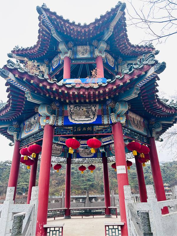 在怀柔的民宿玩了一宿,第二天就近来到这里。 因为是细雨天🌧️,游客少的出奇,整个灵慧山⛰️很安静,这也许才是真正的回归大自然🌬吧。 进入大门能看到一排长长的台阶,台阶的尽头就是圣水观音,通往观音的台阶上拉起了好几种颜色的小风车,观音端坐在上方,好似迎接着众多信徒。圣水观音后方就是七星池,只可惜进入秋季🍂池水渐少,露出了池底的泥土,围着七星池有一圈环形的廊桥,沿桥步行一圈也需要耗费不少体力。 沿着石阶继续往山林深处走,就可以看到朝阳禅寺,穿过寺门就是座落三面的殿,供奉着不同的神仙,再往里走就是大雄宝殿,一颗大松柏🌲遮住些许视角,加上今天游客极少,以及雨水🌧️落在地上呈现的倒影,真的每一处风景都像电影🎞️中的场景。 如果你认为这就是终点那就错了,问过寺中的师傅,才知道继续往山林深处步行,还有诸多风景藏在山中。我们一路前行,途径了很多打卡🤳点,能想象到春夏旺季的时候这里会多热闹。步行🚶🚶♀️约2公里,终于到了最终目的地,朝阳寺,两只狗狗🐶在庭院里似乎等待多时,一直在呼唤我们。寺中的银杏叶落了一地,特别出片。寺中的长老看到我们雨天还来拜佛,给了我们一人一个开了光的桔子🍊,非常香甜。 交通:怀柔区西甘路尽头,虽说有公交🚌可以抵达景区,但是还是强烈推荐自驾🚗来,不然往返路上要5个小时起。 停车🅿️:20元。但是我们去的时候是淡季,停车场的猫🐱都比游客多,于是就没有收费。 门票🎟️:33元。
