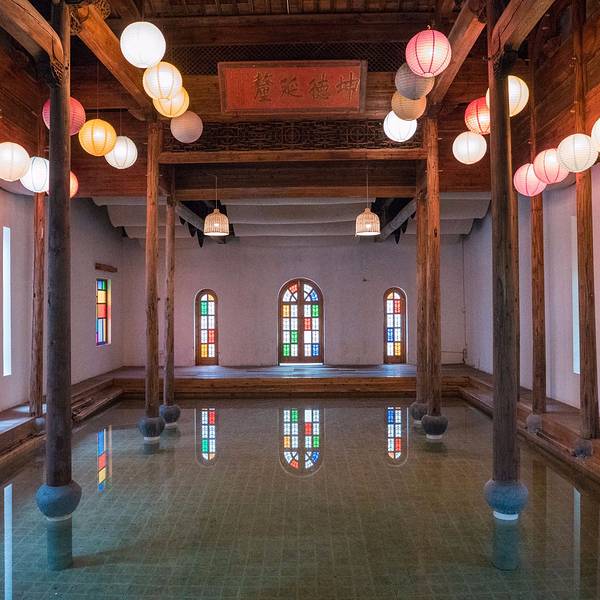 我们早上去的时候天气是阴天,秀里影视城里面也有一条河,水面非常平静,看起来就像一面镜子一样秀里影视城基本也全是徽派建筑这里还有一个冬瓜屋,名字也是特别有意思看介绍说冬瓜屋在古代跟私塾祠堂差不多,而屋子里也是有水,看起来就像漂浮在水中的祠堂一样,尤其好看,远处的五彩缤纷的玻璃窗也是有一丝异域风情
