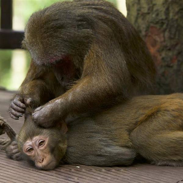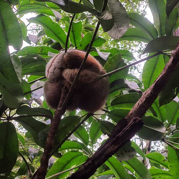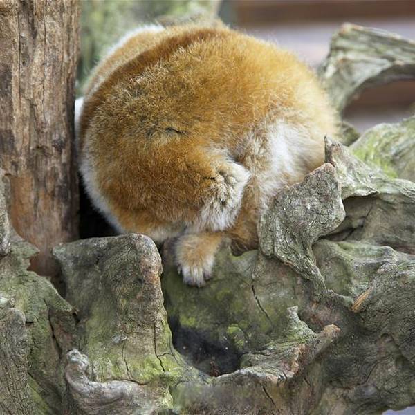 孤立的树桩上,一只毛茸茸的像是球一样的玩意儿竟然会是只猴子。它叫蜂猴,世界最小,属夜行动物,别看它睡觉时的模样特别可爱,它可是一只厉害的小家伙,腋下能排出毒液。当然,在没有受到威胁和伤害的时候,它还是很害羞的。无意间抓拍了一张它突然醒来的模样,虽然还是蜷着身子,但张嘴的那一瞬间就跟打了个哈欠似的。然后接着睡觉,做它的白日梦。如此安静,真是教人打从心眼里喜欢它。于是,其他猴子不高兴了。