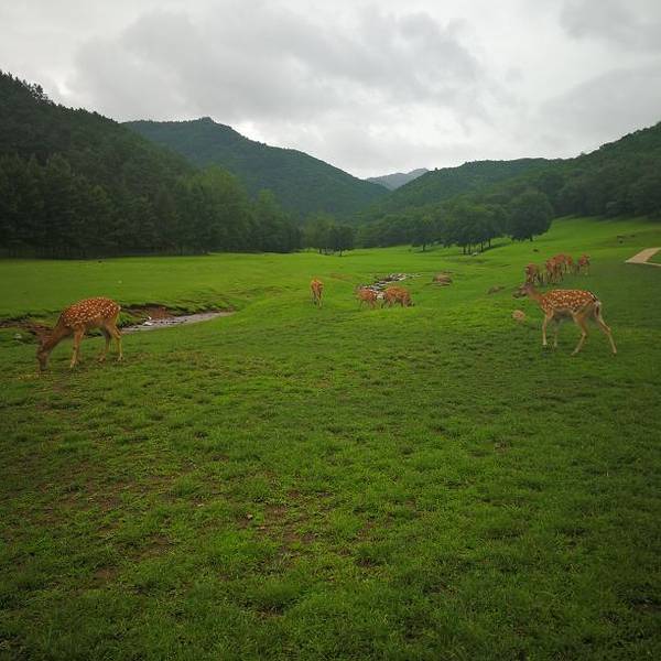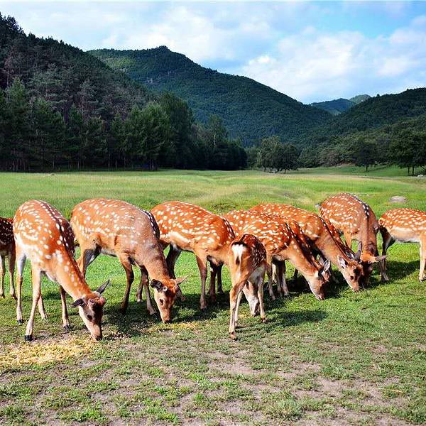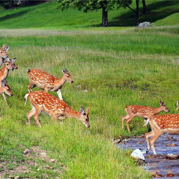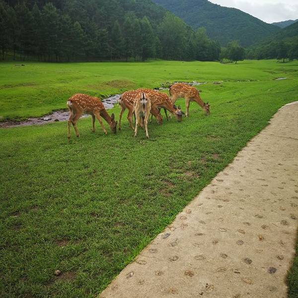 “金山鹿苑”坐落在伊春市金山屯区境内、堪比奈良的天然鹿场、占地面积有60公顷、鹿苑内偌大的草坪...“金山鹿苑”坐落在伊春市金山屯区境内、堪比奈良的天然鹿场、占地面积有60公顷、鹿苑内偌大的草坪宽阔平整、地势微微连绵起伏、中间一条小溪从山间缓缓流下、溪水清澈见底、宛如一个天然的高尔夫球场、偌大的草...“金山鹿苑”坐落在伊春市金山屯区境内、堪比奈良的天然鹿场、占地面积有60公顷、鹿苑内偌大的草坪宽阔平整、地势微微连绵起伏、中间一条小溪从山间缓缓流下、溪水清澈见底、宛如一个天然的高尔夫球场、偌大的草坪四周群山环抱、山脚下围着草坪一条环形栈道、可以悠闲地围着鹿苑草坪漫步、鹿苑以半开放的形式散养着几百头梅花鹿和天山马鹿、小鹿儿在溪流间嬉戏、在草坪上奔跑、由于自然生态环境适宜、也经常有野生鹿出没、鹿苑腹地占有大半个山头、山间的草坪、树林、溪流浑然一体、形成一幅祥和独特的自然美景!