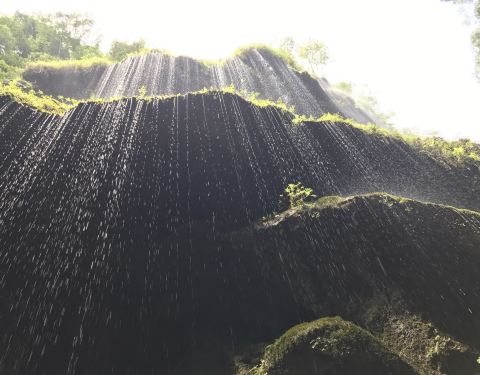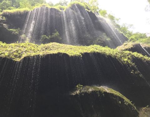 最后一天回到宜昌,安排相对轻松,去了附近的三峡大瀑布。瀑布处在深山中,山外有河流。水很浅,刚可没踝,深处大约六七米,水质清澈没有一丝涟漪,颜色黄绿,像猫的眼睛,大概水中有不少单细胞藻类,有小鱼在里面游动。我们靠近河边,惊起两只白鹭。
