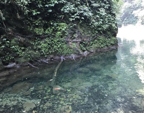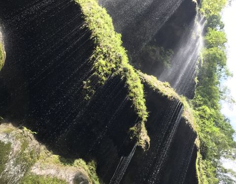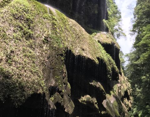 最后一天回到宜昌,安排相对轻松,去了附近的三峡大瀑布。瀑布处在深山中,山外有河流。水很浅,刚可没踝,深处大约六七米,水质清澈没有一丝涟漪,颜色黄绿,像猫的眼睛,大概水中有不少单细胞藻类,有小鱼在里...