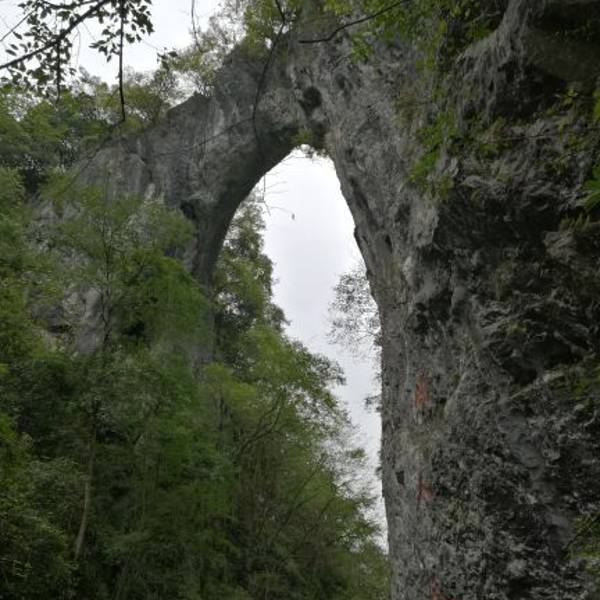 湖南攸县仙人桥景点属典型的喀斯特地貌,是原有地下石灰岩溶洞在地壳抬升作用下大部分顶盖塌陷以后,保留下来的一小块顶盖形成的一座天然石桥。仙人桥位于攸县酒埠江风景名胜区太阳山景区漕泊乡的七里村,石桥下洞高60余米,桥面长约20米,两头窄中间宽,最窄处仅50厘米左右,最薄处也仅2米。此桥天造地设,鬼斧神工。 世上见于记载的天然桥,有的规模很大但桥下没有水,基本上是旱谷,即不再发育的“死谷”。仙人桥峡高雄险。桥下七里峡曲折险美,常年溪流不断,溪水汹涌澎湃或悠然潺潺。峡谷里的石灰岩、火成岩、玄武岩似蹲似卧、张牙舞爪,而且谷内浓荫匝地、绝壁幢幢、瀑雨涟涟。这是一条正在发育中的“活谷”实为世上罕见。