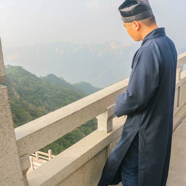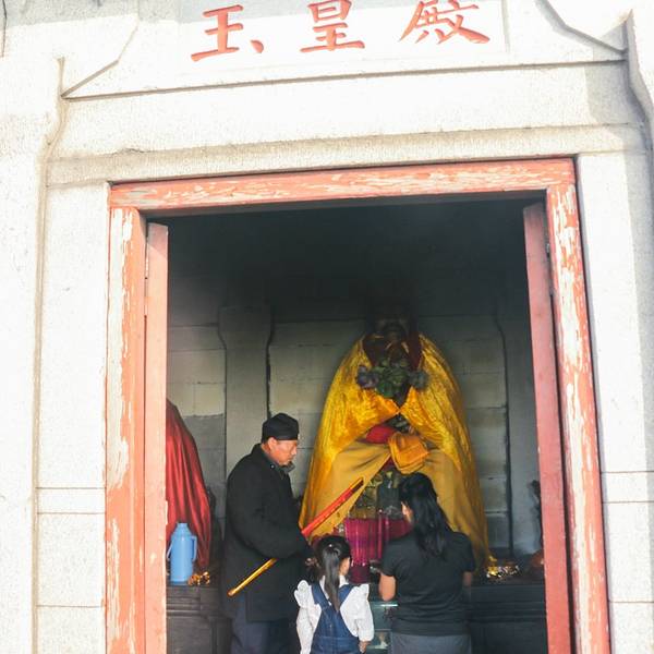 坐车沿盘山路上山,最后一小段路徒步到山顶。蒙山之巅有座小小的玉皇殿,殿里有一老一少两位道长。二人的生活格外与世无争,平日自己种菜,偶尔下山买些粮食,有香客前来便接待一二,无人时跑步健身打太极,让人好生羡慕。