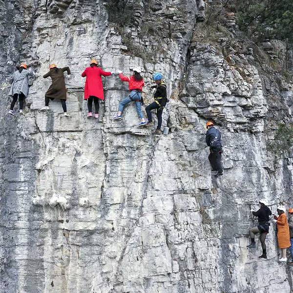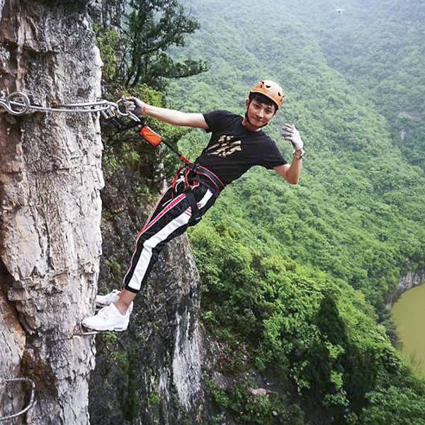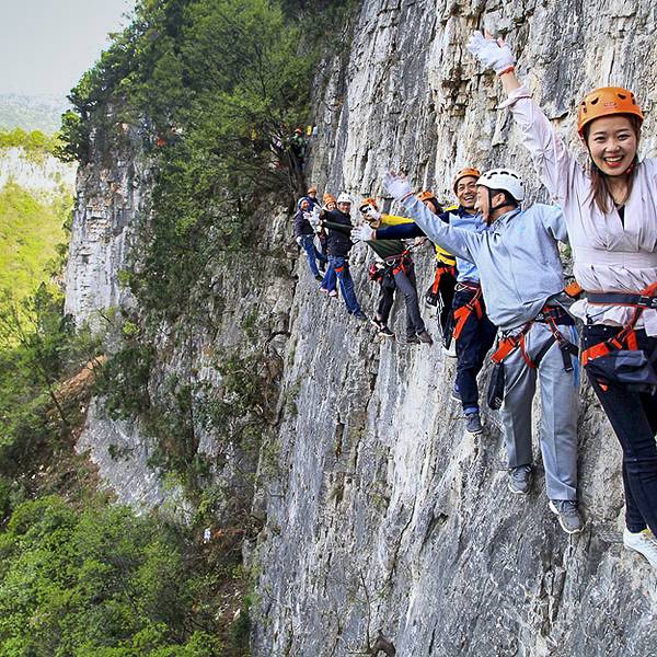 它离地大约150米,安全绳索固定在悬崖中间,远远看着就觉得很刺激飞拉达:是意大利文Via Ferrata,意为岩壁探险或铁道式攀登的音译,它是指在山的岩壁上建造的攀爬轨道,由钢制扶手、踏板、救生索等组成,使没有攀爬能力的人爬上陡峭的悬崖。攀岩运动在欧洲已经发展成为一项流行...飞拉达:是意大利文Via Ferrata,意为岩壁探险或铁道式攀登的音译,它是指在山的岩壁上建造的攀爬轨道,由钢制扶手、踏板、救生索等组成,使没有攀爬能力的人爬上陡峭的悬崖。攀岩运动在欧洲已经发展成为一项流行的运动,目前每年有百万人用这种方式去攀登。在春秋寨就可以体验这项极限运动,飞拉达体验点位于春秋寨对面望月山峭壁中央。它离地大约150米,安全绳索固定在悬崖中间,远远看着就觉得很刺激。飞拉达体验全程长约200米,熟练者可在15分钟内完成空中行走,生手一般也能在45分钟内完成体验。安全员依次为大家穿戴好头盔、手套等安全设备。安全扣、安全绳使用的集中讲解和现场演示,以及攀岩过程中各种突发事件的应急处理,详细周到,认真负责。 展开