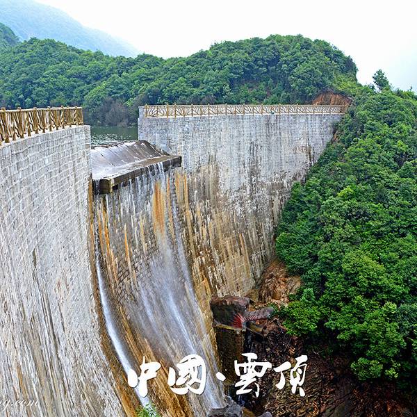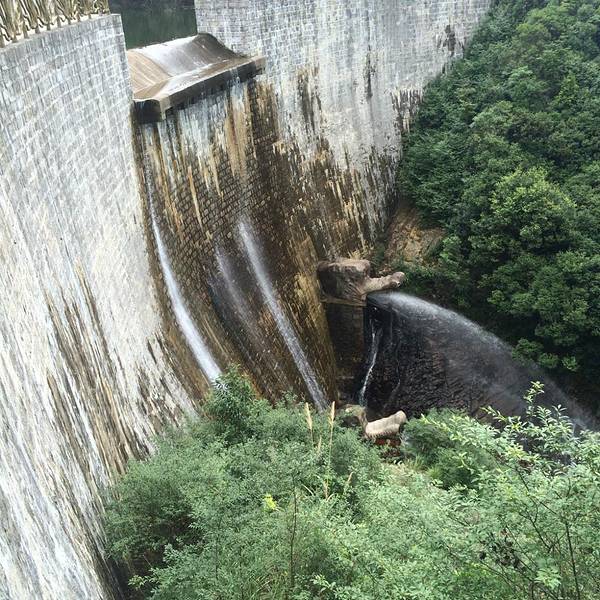 进入大门,首先是一座水库,从下方看,高大宏伟,中间有一个缺口,保持水位,多余的水从缺口倾泻而下;