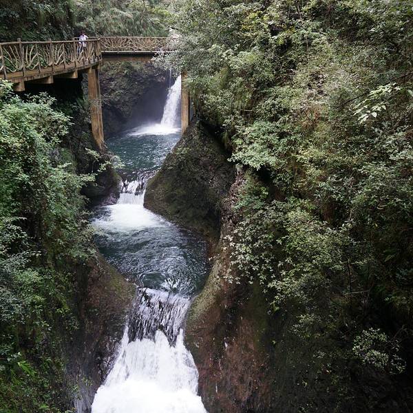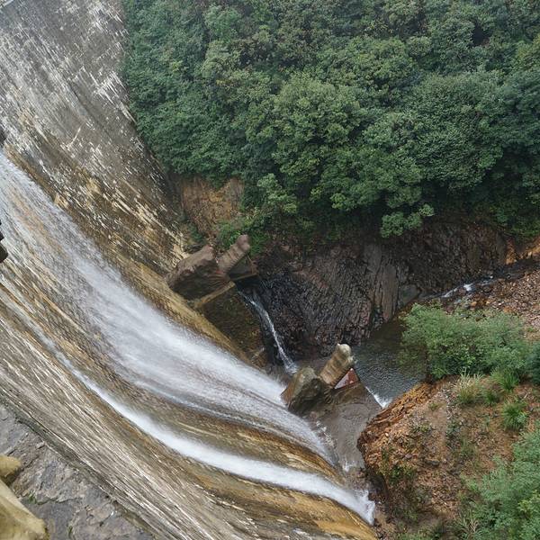 峡谷景区分七彩瀑谷、红河谷、翡翠谷,七彩瀑谷主要是瀑布,一路向下,曲曲弯弯,这一段下山为主,注意,此段众多瀑布其实都是前端水库流下的水;