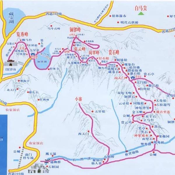 铜锣寨有江北小黄山之称。 奇松,怪石,云海,温泉,黄山有的,铜锣寨都有只不过就规模来说小一些罢了。然而要想成功登顶也并不是一件容易的事情。在通往最高峰之前有个一线天,如果不够苗条可能被卡住[囧]还有一条非常狭窄的通道,叫鲤鱼背。叫这么个名字是非常形象的,因为狭窄陡峭就像是滑溜溜的鲤鱼背脊。上山下山大概需要三四个小时。