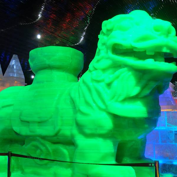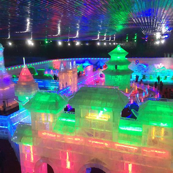冰雕极地大世界,冰雕全部以哈尔滨松花江自然冰为原料,其作品晶莹剔透、流光溢彩,冰雪的生态之美展现无遗。