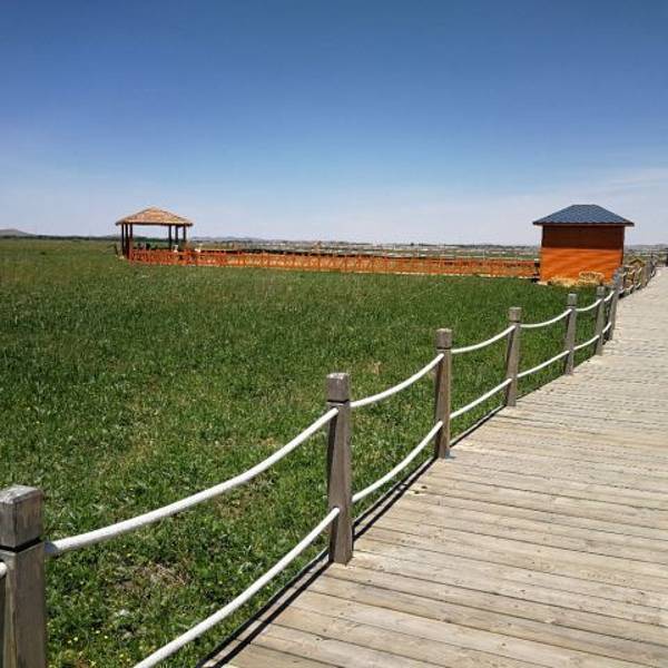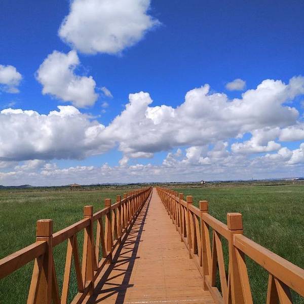 五花草甸美丽的草甸,通过长长的木质栈道可以观赏美丽花海,享受草原的广阔。留下美丽的照片。