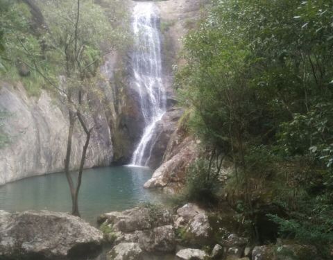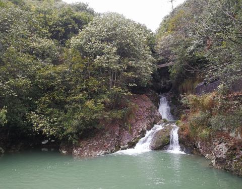 这风景对于山村孩子,应该感觉一般般,他们经常看到,而对于来自大城市的我们,就是惊喜!我们其实是从出口下樟村进的。下樟村,是莫言祖先的隐居地,莫言是在他得诺奖之前,来过此地寻祖,但村民比较朴实,并没以此为卖点。下樟村有很多农家乐,可以在此用餐。要进景点买票时,管理员很关心:“你们午饭吃过没有?你们带伞没有?会被瀑布淋湿的。”我们都没做,就冲进了景区。因为前两天都下雨,白云瀑水很大,毫无意外,被淋个湿透,这时才理解管理员的好意提醒。一路走、一路看、一路拍,沿路还有几个小瀑布,花了2个小时才走到景点的进口:白云岩,再花时间原路返回,有这力也没这心,于是询问进口的管理员:“有没有车可以送我们到下樟村停车场取车?”结果是其中一个管理员开摩托车送LG上去的,还不肯收谢意,真是非常感谢!