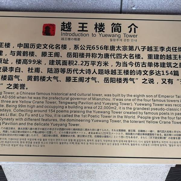 越王楼与黄鹤楼、滕王阁、岳阳楼并称唐代四大名楼,自唐以来,文人雅士题咏越王楼诗篇多达150余篇,故有学者称之为“天下诗文第一楼”。