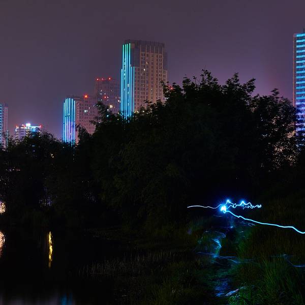 灯光秀使用了LED点阵成像,从涪江二桥一直到桃花岛,涵盖两岸高层建筑,包括40多个楼盘、80多个楼宇立面。16分钟的光影表演,越王楼对面的大厦在变成一幅数公里的巨幕,像画卷一般生动活泼。出场的人物从李白、大禹、嫘祖,到著名的大熊猫,搭配上『小涪娃』的声音解说,用最立体的方式呈现绵阳的科技与人文。