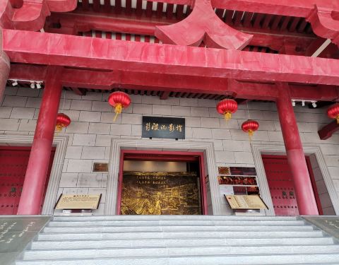 富乐山富乐堂位于绵阳市游仙区,是为纪念刘备与刘璋涪城会盟而建的一处人文景观。富乐堂主体建筑涪城会馆,风格为仿古建筑,红墙黄瓦,飞檐斗拱,气势恢宏。馆内有众多三国文化相关的雕塑、壁画,生动地展现了刘备、刘璋会盟等三国历史场景和故事,文化内涵极为深厚。