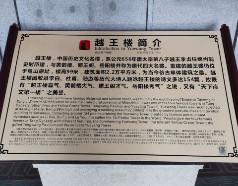 越王楼,位于四川省绵阳市龟山之巅,是唐太宗李世民第八子越王李贞任绵州刺史时所建,始建于唐高宗显庆年间。2001年恢复重建后高99米,有“越王楼霸气、黄鹤楼大气、滕王阁才气、岳阳楼秀气”之说。 越王楼是天下诗文收录丰富的名楼,共收录包括李白、杜甫、王勃、陆游等历代大诗人题咏越王楼诗篇多达154篇(黄鹤楼112篇,滕王阁86篇,岳阳楼、鹳鹊楼虽有名诗文,但并不多),可谓“一座越王楼,半部中国文学史”;诗文作者档次高,除诗仙李白、诗圣杜甫外,几乎涵盖唐代以后的著名诗坛泰斗,算得上“天下诗文第一楼”。 唐代的越王楼高十丈(即百尺)。按照唐代一尺约为29.4厘米来计算,则其高度为29.4米。 现代重建后的越王楼的主楼内外15层,底面东西宽66米,南北长88米,高99米,主体工程为钢筋混凝土框架仿古结构,外部为唐式昂斗飞檐歇山式风格,配套建筑有廊、亭、阁、榭、台、广场、商场、停车场、园林等。工程规划用地84亩,建筑总面积2.77万平方米。 重新规划设计的越王楼仿古建筑群与周边众多名胜美景融为一体,东望富乐(山)、西接碧水(寺)、南眺南(山)塔、北连九院(科学城),踞龟山傍涪水,揽绵州之胜于无余。