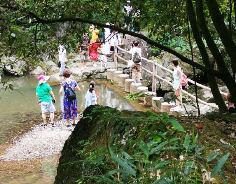 游览栈道俯瞰谷底,植被茂密,山径弯曲,飞瀑... 徜徉于磐安水下孔景区游览,在美丽的自然景色中陶醉,在轰鸣的瀑布声中沉思,真切感受到了旅游特有的轻松与惬意。
