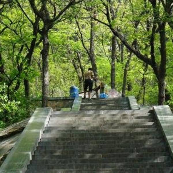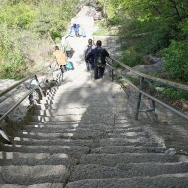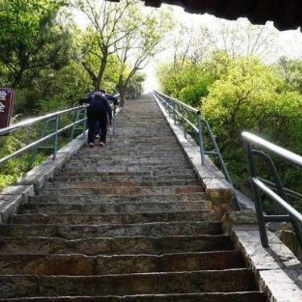 进过中岳行宫不远就是天梯,难度最大的一段路开始...登山步道,沿着步道走30分钟左右就到了太室山广场,也就是检票口。过了检票口首先就是老君洞