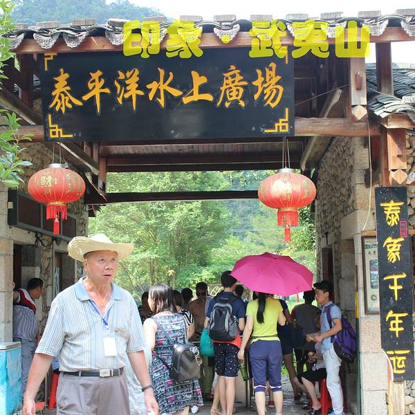 水上广场是夏日的天堂。它形成于一亿四千万年前,是一片巨大的花岗岩体,铺展水底且与周边山体相连。长约1380米,最宽处达150米。平坦岩面,经测量总面积达11万平方米以上。目前已开发4.8万平方米。石面平滑如砥,无缝无苔,布水均匀,仅没脚裸,洋面波光粼粼,蔚为奇观。水上广场的上半段是总面积为1.7万平方米的亲水嬉戏区,水深仅没脚踝,在这里人人戏水,人人亲水,踩水、冲浪、打水仗、水上太极、水上拔河各得其乐,各寻其趣。朋友们到此可以游泳亲水,也可以租借橡皮艇划桨戏水(10分钟10元,以此类推)。泰平洋水上广场右畔山麓,田地平旷。就算不玩水,里面还有很多小猴仔哦!