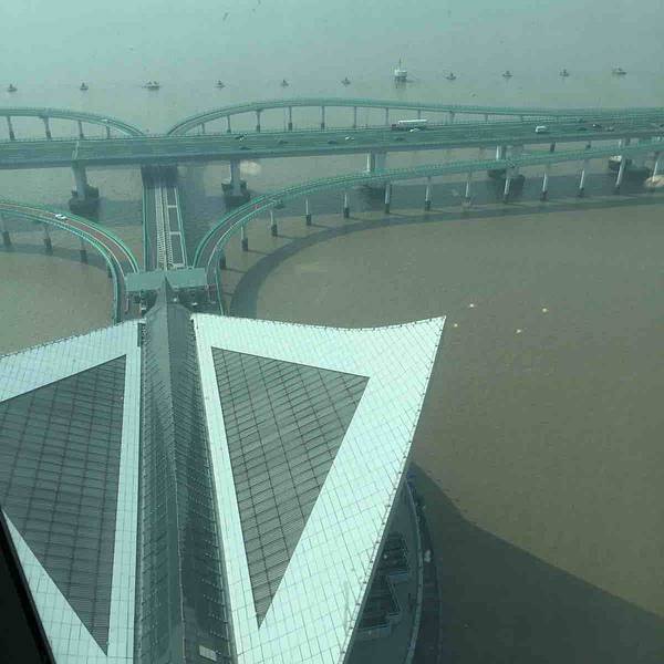 在户外露天观光平台游走观望,海景是无敌的辽阔。但江浙一带的海水偏黄,且伴有海腥气味,但在天气晴好的情况下拍照是极好的。如果购买的联票,逛完了主体平台,可以直穿通道进入观光塔。观光塔高145.6米,三层是露15~17层为观光层,游客可以搭乘高速电梯进入。因塔顶运用特殊圆形钢构件玻璃幕墙的材质,展示出珍珠钻石般的形态和光芒。如果晚上来,可以看大桥夜景,灯光璀璨,特别漂亮。