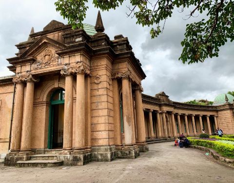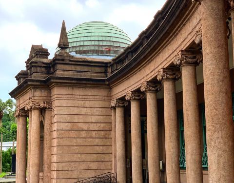坐在充满历史痕迹的洗石阶梯上,斑驳又带点裂痕的... 台北自来水博物馆外型仿自古希腊神殿,风格独特精美。 博物馆正面,有一长串半圆弧形的列柱,内部屋架为钢骨构造,窗格以铁件铸造,后方整排的绿色木窗棂。
