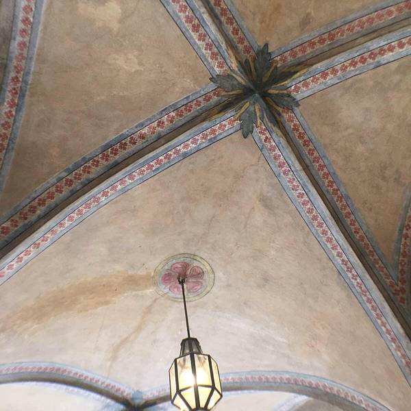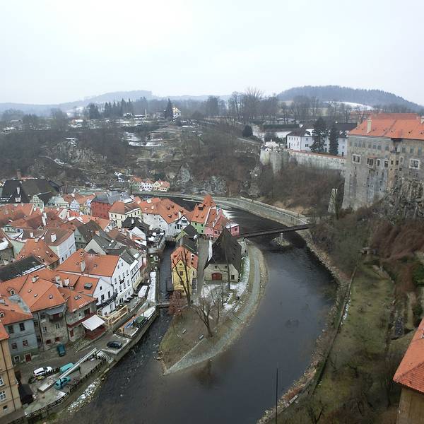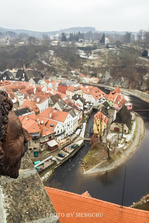 城堡地处小镇的制高点,有着优雅的拱形长廊,还有漂亮的彩绘墙体。在城堡的墙垛旁可以俯瞰小镇全貌,被伏尔塔瓦河环绕的CK小镇,高高矮矮密密仄仄的红色房顶,圣维塔教堂静静的伫立在河畔,惹眼的青色尖顶,随便哪个角度都如同明信片一样美。可惜今年的雪不够大,不然一定会更美。若要欣赏小镇的极致美景,还是需要进到城堡内。门票分为两部分,彩绘塔和博物馆,只是看风景的话,买彩绘塔的票就足够了,50kc/人。攀着窄仄的楼梯上到塔顶,登高远眺,美景尽收眼底,果真不负世界上最美小镇的盛誉。17:00 洞穴餐厅Kr?ma v ?atlavské