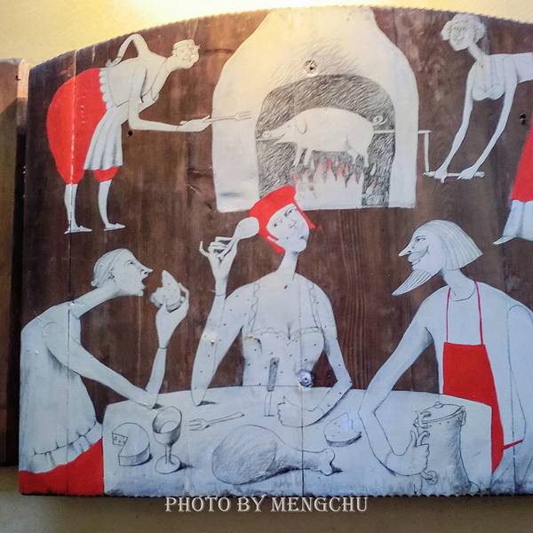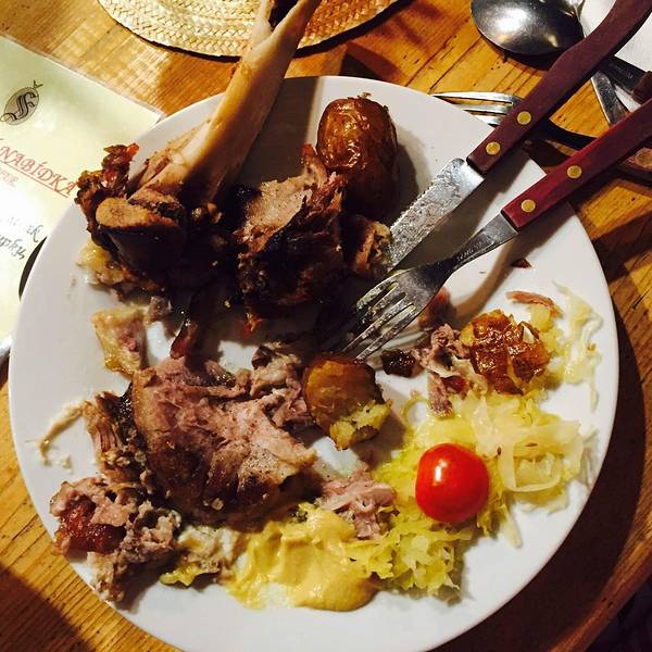尽管还没到饭点儿,餐厅里并没有人满为患,但大部分的座位都已经被预订了,只能无奈看着壁炉里的大肘子留口水。为了方便后人,留一个他家的预约e-mail:info@satlava.cz。一定要提前预约哦,永远慢客。