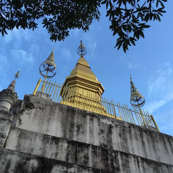 普西山的位置就在古城中心,基本都可以步...作为琅勃拉邦的最高点,山上的金顶,古时的王宫,以及俯瞰全城的绝佳地理位置和日出日落还是十分值得一去的。先来一张意为“光辉祥瑞”的金顶接下来就是俯瞰全景的美色。
