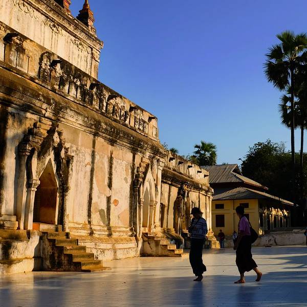 第一个参观的寺院是马努哈寺。寺庙里,正面是三尊巨大的佛像,而背面有一尊20米长的大卧佛用完早餐稍作调整后,前往旧蒲甘把昨天没有去过的佛塔走上一遍。