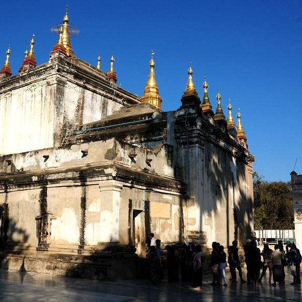 第一个参观的寺院是马努哈寺。它位于在明卡巴村的南边,由Manuha国王于1059年建造,他是被俘虏的孟族国王。寺庙里,正面是三尊巨大的佛像,而背面有一尊20米长的大卧佛。与巨大佛像不相称的是,容纳佛像的庙宇却修得非常狭小,它不像蒲甘其它的寺庙那样追求壮观,空间狭窄的基本上你都觉得是头快顶到房檐,肩膀要碰到墙壁,如果不侧着身子便无法行走。而之所以会被修成这样,也是因为作为一个被俘虏过来当人质的国王,Manuha借着修建这样的寺庙来表达自己内心的压抑和痛苦。马努哈寺门口有一个巨大的金钵,里面有信徒们的捐款。 展开
