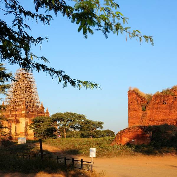 然后我们一路穿过新蒲甘沿着一条大路往娘乌方向走,导航来到昨天经过的Paya,Thon Zu佛塔,这里聚集着好几座佛塔,夕阳正好,几个踢藤球的少年在漫天尘土中玩得很高兴。我们也趁着极好的火红光线拍了几张和摩托车...