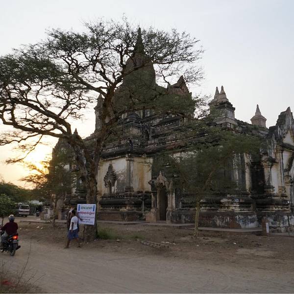 首先,去去瑞西光塔,会经过一大两小三座佛塔,看上去有些年份了。其中小的两座佛塔紧挨在一起,稍高的一座名叫Lin Pya Gu Hpaya,而红砖砌成的没有名字。边上最高的佛塔叫 吐台莫古寺(Thuhtay Mokgu Hpaya),是一座双层寺庙建筑。在这座寺庙内被发现的一块石碑于1970年被移至考古博物馆内展出。碑文上显示,这座寺庙是1197年由一位富商和他的妻子出资建造的。一层大厅内有壁画,天花板上的壁画中绘有佛祖的脚印,大厅内部有四个佛像坐立在四个方向。关闭无法进入,只能外围看看