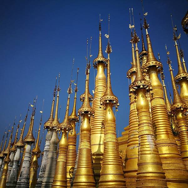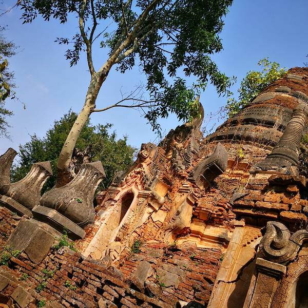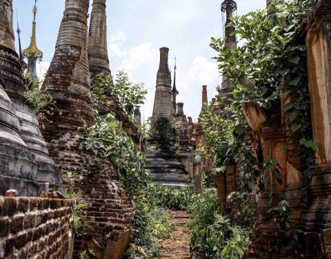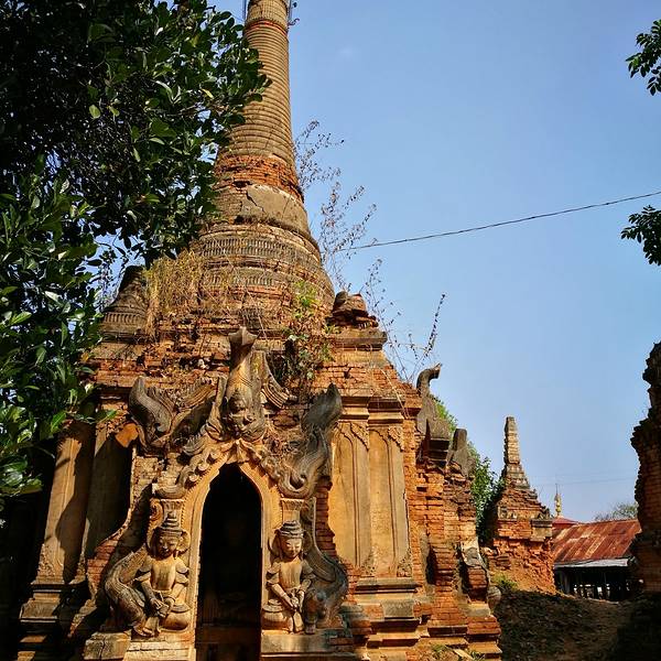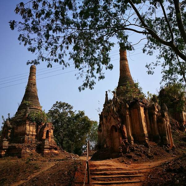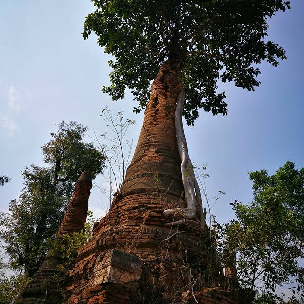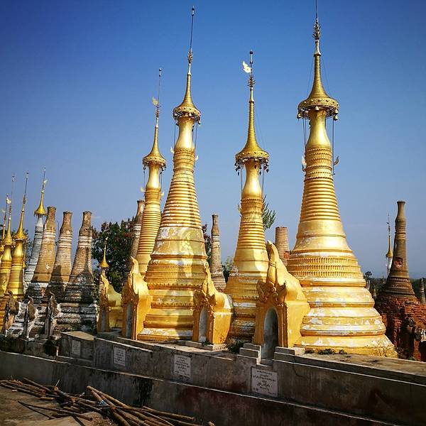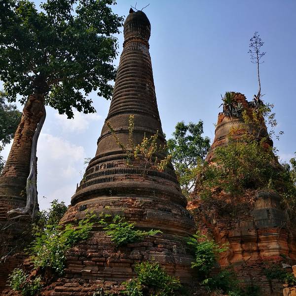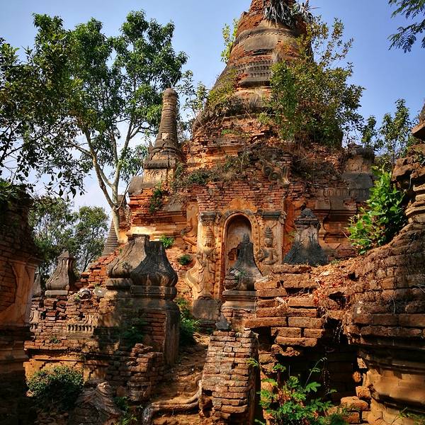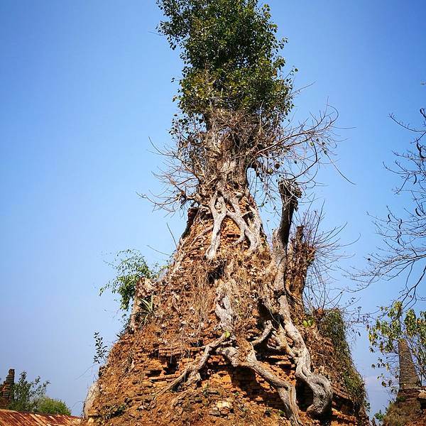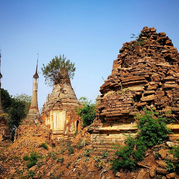 Indein只能乘船前往,一般来说茵莱湖包船一日游的都会来这里。Indein村位于茵莱湖的西南角,离开湖沿着蜿蜒的小溪还要开大概20分钟的船程。航道不宽,但两艘船相会行驶没有问题,就是转弯不少,突然对面冒出来一艘小船,还是挺考验驾船技巧的。游人如织的码头下来就是村庄,当然大家都是冲着佛塔寺庙来的。进入的时候会有人收照相费,如果有相机需要付点钱,我们没有,直接进去了。进去是一个有顶的长廊,左右手边全是卖旅游纪念品的,其实长廊的外面就是一大片历史悠久的佛塔的废墟,叫做Nyaung Ohak,所以千万不要只买东西,要钻出来看看外面的风景。这片废墟有成百的佛塔,看介绍也是差不多十三四世纪建造的,跟蒲甘的佛塔同期。但显然没有受到很好的保护,被破坏地很严重,现在能看到的基本都是残垣断壁了。还能依稀地看到不少雕塑,但绝大部分佛像都没有了头,让人想起莫高和龙门石窟的境遇,不知道这些佛像的头又在西方或者哪里的博物馆里藏着呢!树和藤也成为这里特别的一道风景,像是柬埔寨吴哥窟的一景,树和佛塔相亲相爱的共生着,千百年来的缠绕和依存,已经让它们分不清谁是树,谁是佛塔了。从废墟回到购物大道,继续往上爬,来到由1054座密集佛塔组成的Shwe Inn Thein Paya。这里的佛塔的状况大大好于几步之遥的废墟,大部分披金戴银。看到几乎每座佛塔上都有名字,一些是缅甸文,还有不少是外国人,看来是定向资助,难怪得到了比较好的修缮和保护。规模如此密集的佛塔在缅甸也是数一数二,清脆的风铃声忽远忽近地传来,游客和朝圣者安静地穿梭着,不由得感觉到一股平静祥和的力量,从内心发出,向远方播去。