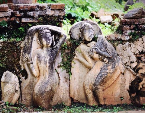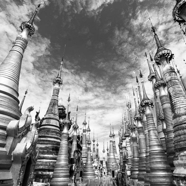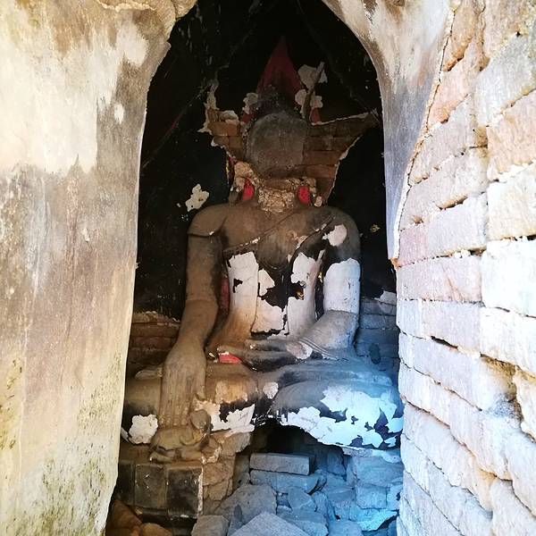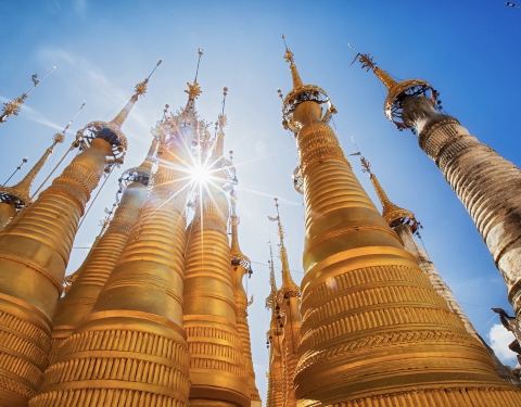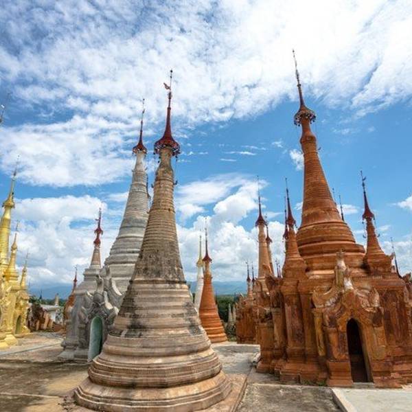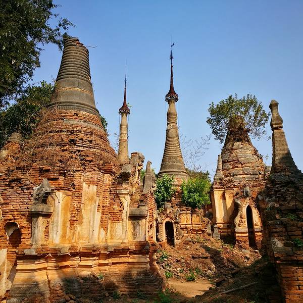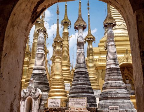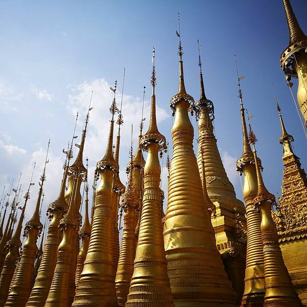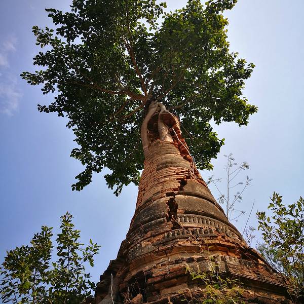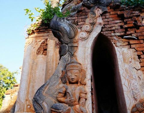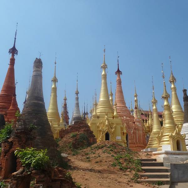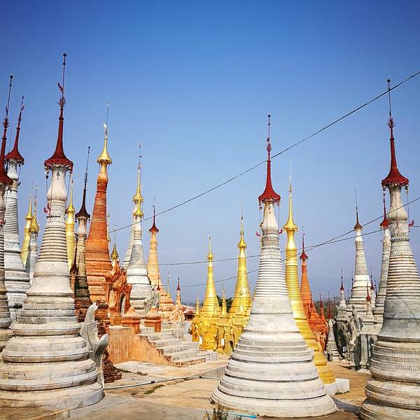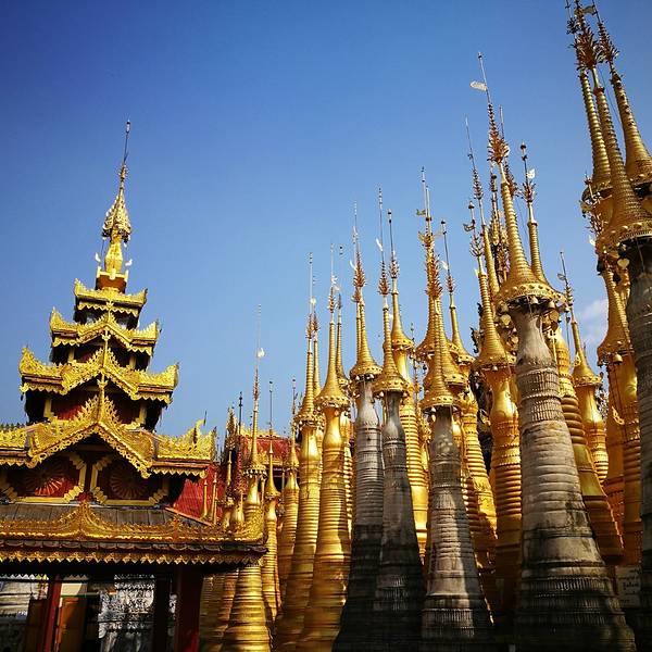 Indein只能乘船前往,一般来说茵莱湖包船一日游的都会来这里。Indein村位于茵莱湖的西南角,离开湖沿着蜿蜒的小溪还要开大概20分钟的船程。航道不宽,但两艘船相会行驶没有问题,就是转弯不少,突然对面冒出来一艘小船,还是挺考验驾船技巧的。游人如织的码头下来就是村庄,当然大家都是冲着佛塔寺庙来的。进入的时候会有人收照相费,如果有相机需要付点钱,我们没有,直接进去了。进去是一个有顶的长廊,左右手边全是卖旅游纪念品的,其实长廊的外面就是一大片历史悠久的佛塔的废墟,叫做Nyaung Ohak,所以千万不要只买东西,要钻出来看看外面的风景。这片废墟有成百的佛塔,看介绍也是差不多十三四世纪建造的,跟蒲甘的佛塔同期。但显然没有受到很好的保护,被破坏地很严重,现在能看到的基本都是残垣断壁了。还能依稀地看到不少雕塑,但绝大部分佛像都没有了头,让人想起莫高和龙门石窟的境遇,不知道这些佛像的头又在西方或者哪里的博物馆里藏着呢!树和藤也成为这里特别的一道风景,像是柬埔寨吴哥窟的一景,树和佛塔相亲相爱的共生着,千百年来的缠绕和依存,已经让它们分不清谁是树,谁是佛塔了。从废墟回到购物大道,继续往上爬,来到由1054座密集佛塔组成的Shwe Inn Thein Paya。这里的佛塔的状况大大好于几步之遥的废墟,大部分披金戴银。看到几乎每座佛塔上都有名字,一些是缅甸文,还有不少是外国人,看来是定向资助,难怪得到了比较好的修缮和保护。规模如此密集的佛塔在缅甸也是数一数二,清脆的风铃声忽远忽近地传来,游客和朝圣者安静地穿梭着,不由得感觉到一股平静祥和的力量,从内心发出,向远方播去。