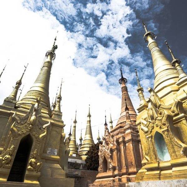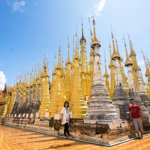 金骆驼 树和藤也成为这里特别的一道风景,像是柬埔寨吴哥窟的一景,树和佛塔相亲相爱的共生着,千百年来的缠...Indein只能乘船前往,一般来说茵莱湖包船一日游的都会来这里。Indein村位于茵莱湖的西南角,离开湖沿着蜿蜒的小溪还要开大概20分钟的船程。航道不宽,但两艘船相会行驶没有问题,就是转弯不少,突然对面冒出来一...Indein只能乘船前往,一般来说茵莱湖包船一日游的都会来这里。Indein村位于茵莱湖的西南角,离开湖沿着蜿蜒的小溪还要开大概20分钟的船程。航道不宽,但两艘船相会行驶没有问题,就是转弯不少,突然对面冒出来一艘小船,还是挺考验驾船技巧的。游人如织的码头下来就是村庄,当然大家都是冲着佛塔寺庙来的。进入的时候会有人收照相费,如果有相机需要付点钱,我们没有,直接进去了。进去是一个有顶的长廊,左右手边全是卖旅游纪念品的,其实长廊的外面就是一大片历史悠久的佛塔的废墟,叫做Nyaung Ohak,所以千万不要只买东西,要钻出来看看外面的风景。这片废墟有成百的佛塔,看介绍也是差不多十三四世纪建造的,跟蒲甘的佛塔同期。但显然没有受到很好的保护,被破坏地很严重,现在能看到的基本都是残垣断壁了。还能依稀地看到不少雕塑,但绝大部分佛像都没有了头,让人想起莫高和龙门石窟的境遇,不知道这些佛像的头又在西方或者哪里的博物馆里藏着呢!树和藤也成为这里特别的一道风景,像是柬埔寨吴哥窟的一景,树和佛塔相亲相爱的共生着,千百年来的缠绕和依存,已经让它们分不清谁是树,谁是佛塔了。从废墟回到购物大道,继续往上爬,来到由1054座密集佛塔组成的Shwe Inn Thein Paya。这里的佛塔的状况大大好于几步之遥的废墟,大部分披金戴银。看到几乎每座佛塔上都有名字,一些是缅甸文,还有不少是外国人,看来是定向资助,难怪得到了比较好的修缮和保护。规模如此密集的佛塔在缅甸也是数一数二,清脆的风铃声忽远忽近地传来,游客和朝圣者安静地穿梭着,不由得感觉到一股平静祥和的力量,从内心发出,向远方播去。 展开