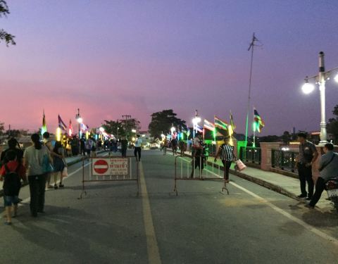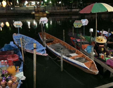 水上市场晚上还是挺不错的,灯光效果很好,小贩们都把船停在岸边,穿上摆满了各种新奇的小吃,饮料之类的。买东西付钱也很有趣,他们把吃的放在篮子里用竹竿递过来,然后我的钱放进去,交易就完成啦。还挺好玩的。有时候下午会有表演什么的。吃的也很便宜,还有一些卖当地服装的,可以买条大象裤之类的。