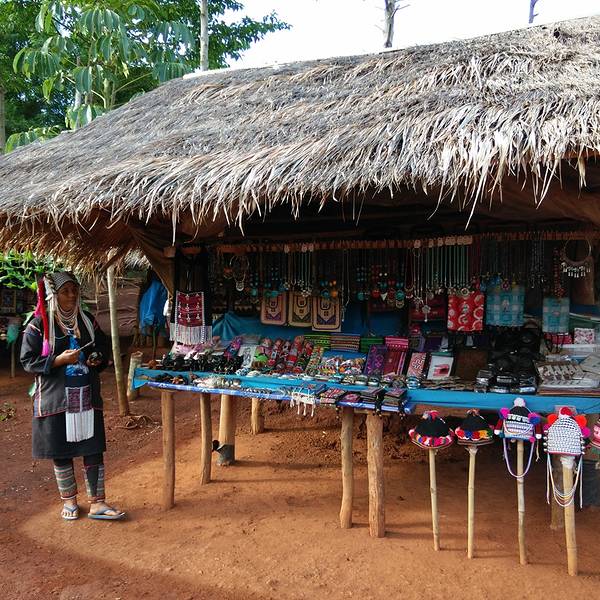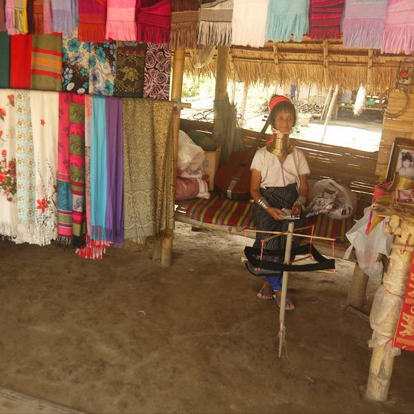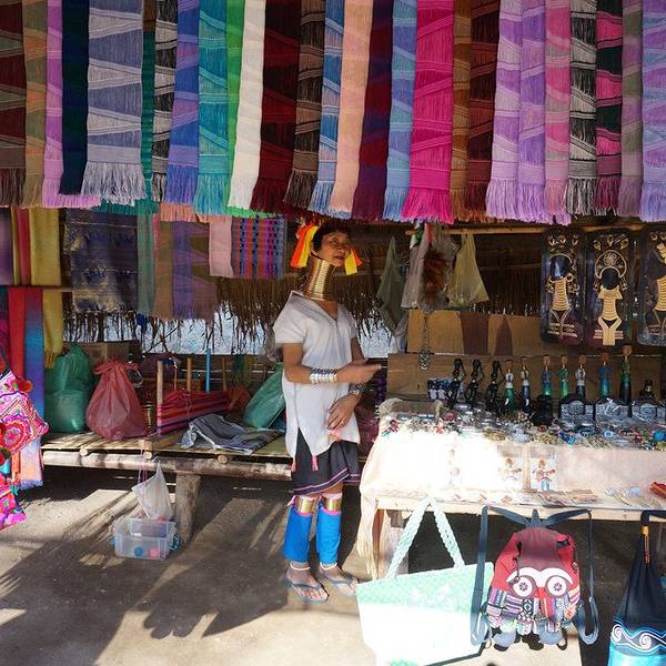沿着步道向里穿行,长颈族妇女在两边摆了很多小摊,出售自己编织的手工艺品。她们的脖子上套着厚重的金项圈,将脖子拉的很长,看上去会觉得有些别扭。
