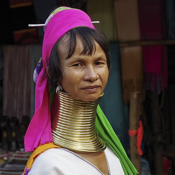 相传,这支民族曾经认为脖子上的项圈是一种美的体现。妇女们从十岁左右起,就会在脖子上套金项圈,随着年岁增加,数量也随之逐渐增加。很多上了年纪的妇女,脖子上套着重达几公斤的项圈,也因而将她们的肩膀压得变形。