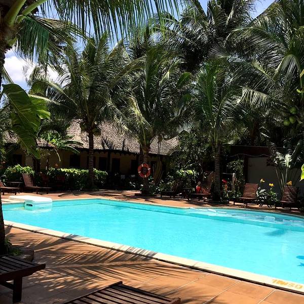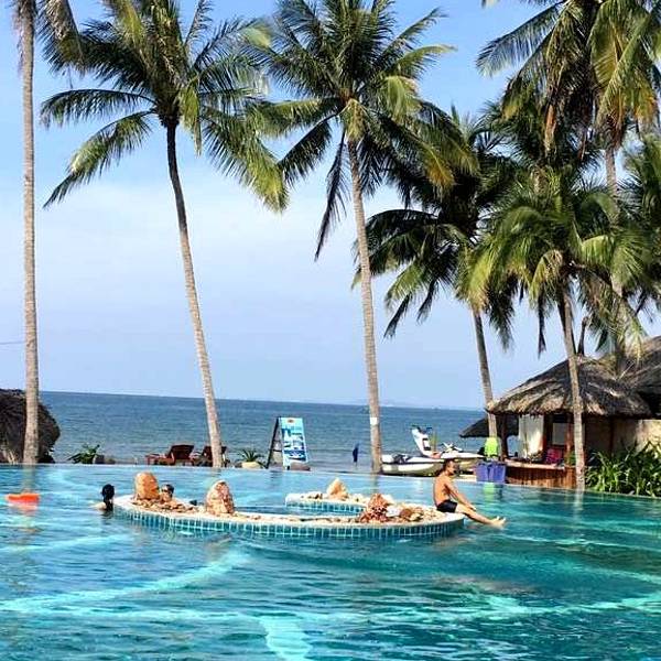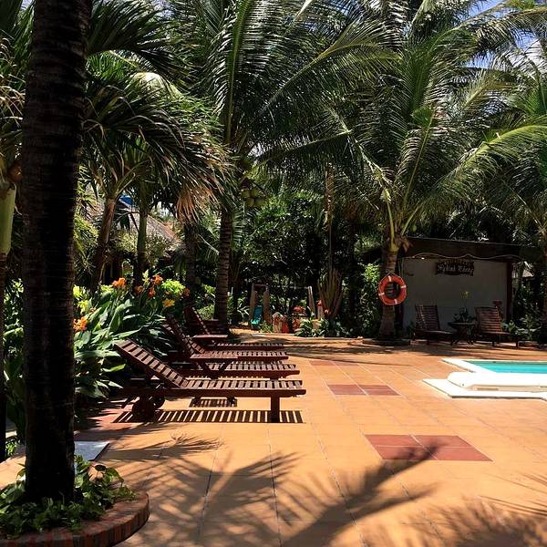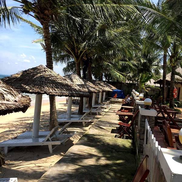 超级high,国内的泳池都不让跳水,这里没有这个限制,我们开发了各种低级无聊的跳水姿势,然后自...我们买了第二天早上九点半的大巴去美奈,至于买票的地方路边上都有很多门票是大巴售票的处,随便一家都可以买,到点集合的时候,会有人把各个代售点的客人领着一起去一个地方集合坐大巴,去美奈大概五个小时,好...我们买了第二天早上九点半的大巴去美奈,至于买票的地方路边上都有很多门票是大巴售票的处,随便一家都可以买,到点集合的时候,会有人把各个代售点的客人领着一起去一个地方集合坐大巴,去美奈大概五个小时,好像五十几块钱,是那种可以躺着睡觉的大巴,一人一个单独的类似躺椅的作为,上车要拖鞋,很干净。早上我们还特意早起去吃了一家早饭,不得不说越南的汤啊粉啊什么的真的太好吃了,随便一家都很好吃,超级鲜,但是左上角的菜超级难吃,一股茴香的味道,但是本地人好像很喜欢吃。五个小时之后我们到了美奈,车上冷气超级足,我们几个虽然裹着车上的毯子还是冻得瑟瑟发抖,大巴停在类似转运站的地方,附近没有看到出租车,好几个摩的在那等着,于是我们五个人做了四辆摩的走了。美奈的住宿是离他们这边城镇中心比较偏的一个类似独家山庄的地方,靠近海边,里面都很多个独栋别墅,还有公共的游泳池,在美奈的两天我们简直爱上了这里的游泳池,试问这么热的天有什么比游泳更舒服的吗?没有。四五个人一起出去太适合租栋别墅了,才四百多一晚上,性价比逆天,放了行李换了短裤背心我们就出去了,因为很靠近海边,我们就先步行去海边玩了,美奈这边的主要特色就是海和沙漠,还有几个景点,像是仙女溪和白沙漠什么,我们商量了下都没有去,真是又穷又懒的一群游客。