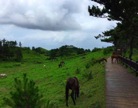果然如朋友们推荐的一样非常美。 松岳山位于山房山南侧约400米的地方,加波岛貌似触手可及,再坐半小时的船可抵达韩国最南端的马罗岛。 松岳山的特点是临海环山路,同时也是济州岛10号偶来小路。 沿着海边悬崖上的小路散步。一边是平坦的绿地,一边是峭壁下深蓝色的大海.. 感觉非常奇妙!无论从哪个角度看都很美。 环山路末尾还有自由散养的牧马区,可以超级近距离地从马儿身边路过。 PS. 松岳山山顶因为访客众多受损严重,登顶路线将封锁到2020年7月。 虽然暂时无法登顶松岳山,但是松岳山环山路依然美好 很值得一去。