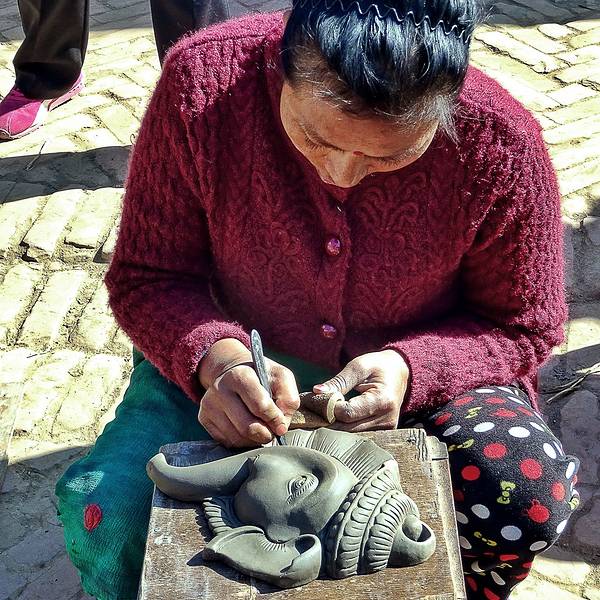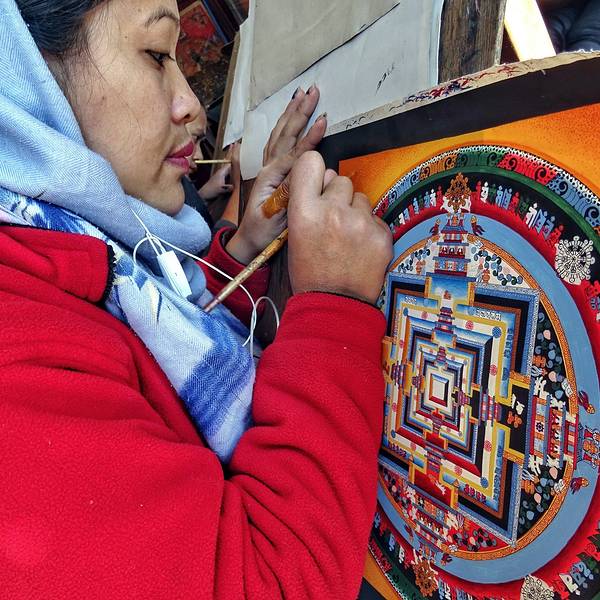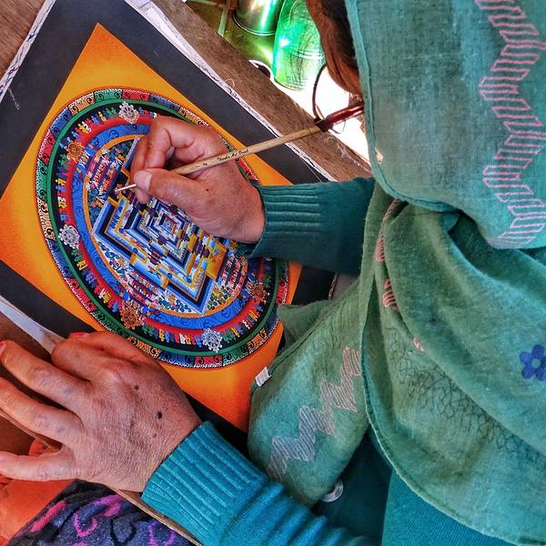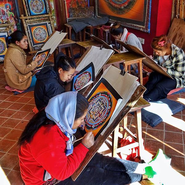 远远就看到一群当地人,围在一起聊天说笑,过去一瞧,原来有人正在打磨一个大象的工艺品,我蹲在她旁边看,周围的人并没有因为我的加入而尴尬、好奇,还是照样聊着,笑着。午后温暖的阳光照进这家唐卡店,里面的画师们席地而坐,正在用简单的工具,专注地绘制着曼陀罗,我好奇每个人的进度都一样,难道是老师带着一起画的?
