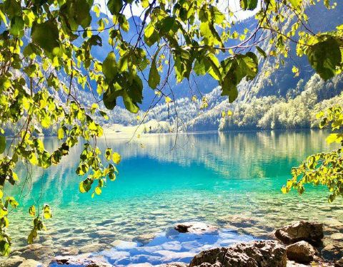 很梦幻的一个地方,很漂亮,湖水清澈的让你分不清虚幻了,而且湖边有大片的草坪,一派绿意盎然的景色,湖面上可以乘船游览,也可以沿湖徒步。