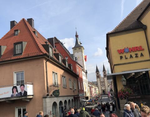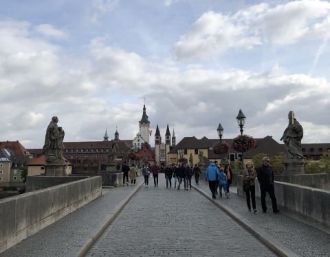 我们自驾从罗腾堡去法兰克福中途路过了这座城市。把车子停在美因河畔边上的停车场,然后步行来到了老美因桥。桥不长也不宽,但从建筑来看已经很久历史了。桥上三三两两散步蹓狗的人,还有一些街头艺人在表演,一副安详宁静的气氛。